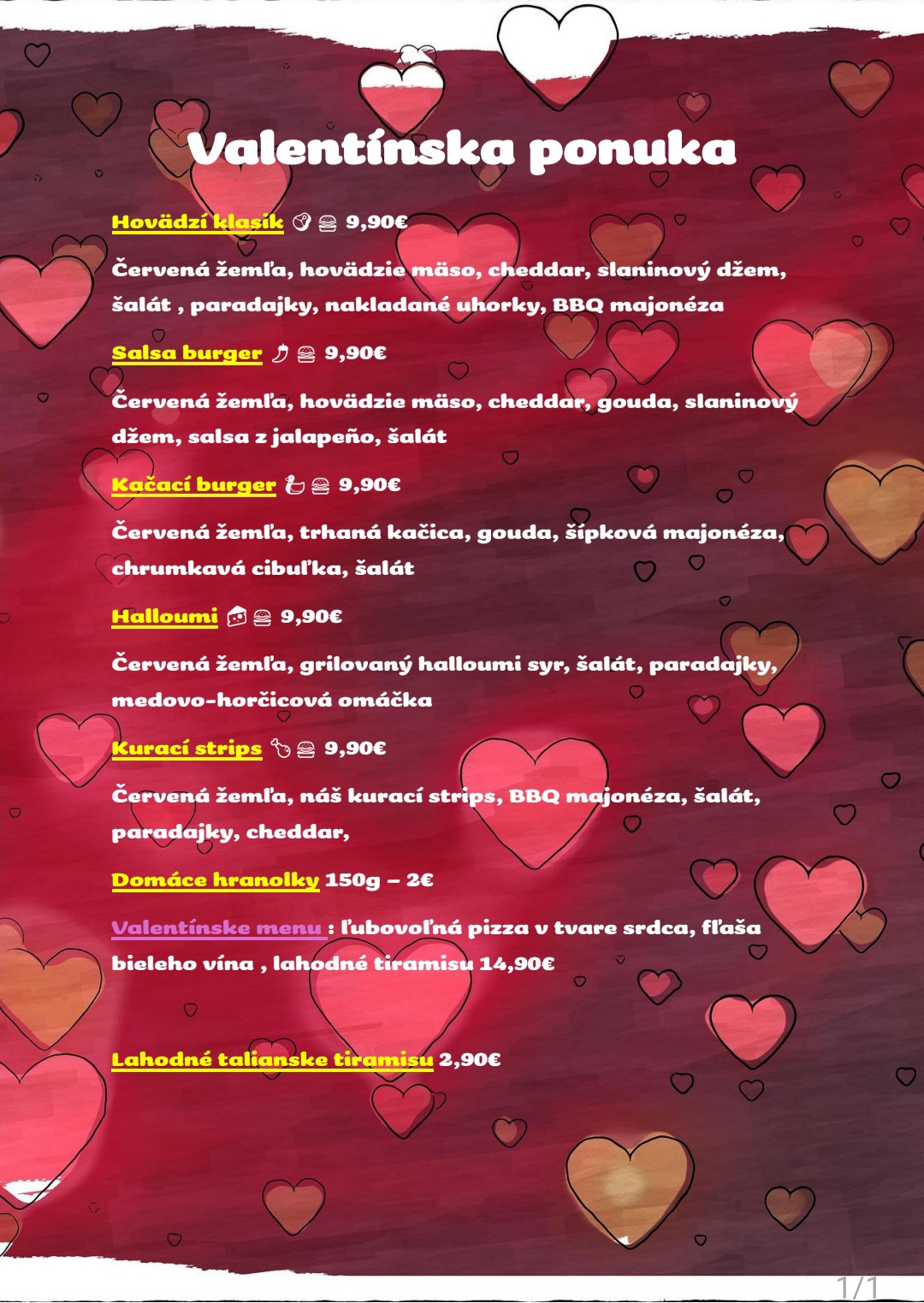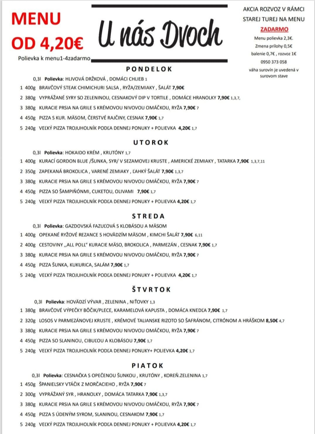 1,4€ - šunka 70g , salám 70g , slanina 70g, mozzarella 120g, údený syr 70g, niva 70g, špenát 50g , rukola 50g , bryndza 60g , tuniak 70g ,